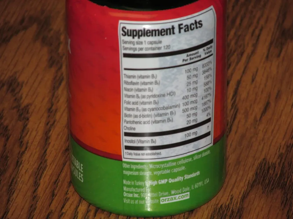 Składniki: substancja wypełniająca: celuloza mikrokrystaliczna, chlorowodorek tiaminy (witamina B1), kapsułka roślinna (hydroksypropylometyloceluloza), mio-inozytol, ryboflawin-5’-fosforan sodu (witamina B2), D-pantotenian wapnia (witamina B5), dwuwinian choliny, nikotynamid (witamina B3), substancja przeciwzbrylająca: stearynian magnezu, chlorowodorek pirydoksyny (witamina B6), cyjanokobalamina (witamina B12), substancja przeciwzbrylająca: dwutlenek krzemu, biotyna, kwas foliowy.